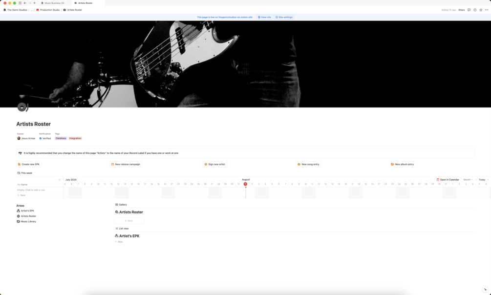 Music Business OS by The Gemz Studios is a comprehensive Notion-based operating system designed for music industry professionals, including musicians, songwriters, artists, producers, mixing and mastering engineers, and indie record labels. This template helps users manage finances, projects, business documentation, invoices, CRM, and all music business-related operations. Featuring new integrations and databases for accounting, brand assets, record label management, calendars, documents, project management, and social media management, it streamlines creative, technical, and management processes. Users gain access to the Discord community, exclusive discounts, professional consulting, and free support for all templates owned. The system is continuously updated with new resources and workflows to enhance efficiency and organization.